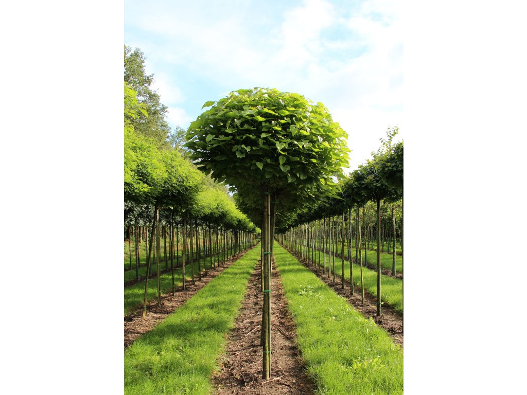 Katalpa trubačovitá 'Nana' (Catalpa bignonioides 'Nana') s obvodem kmene 10–12 cm je mladý strom s pravidelnou kulovitou korunou, často využívaný v městských a soukromých zahradách.