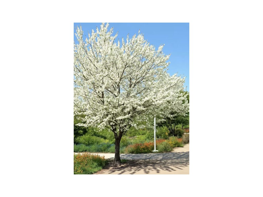 Zmarlika jídášova 'Alba' (Cercis siliquastrum 'Alba') s obvodem kmene 10–12 cm je mladý strom s bílými květy, které se objevují přímo na kmeni a starších větvích.